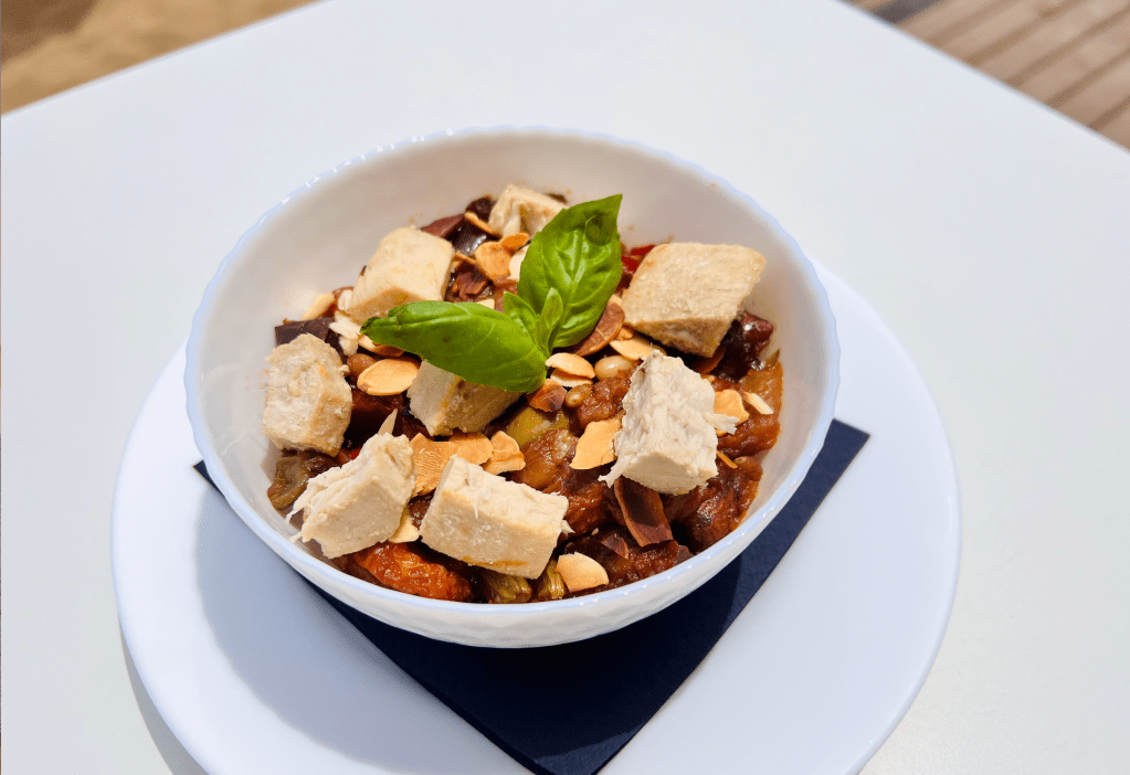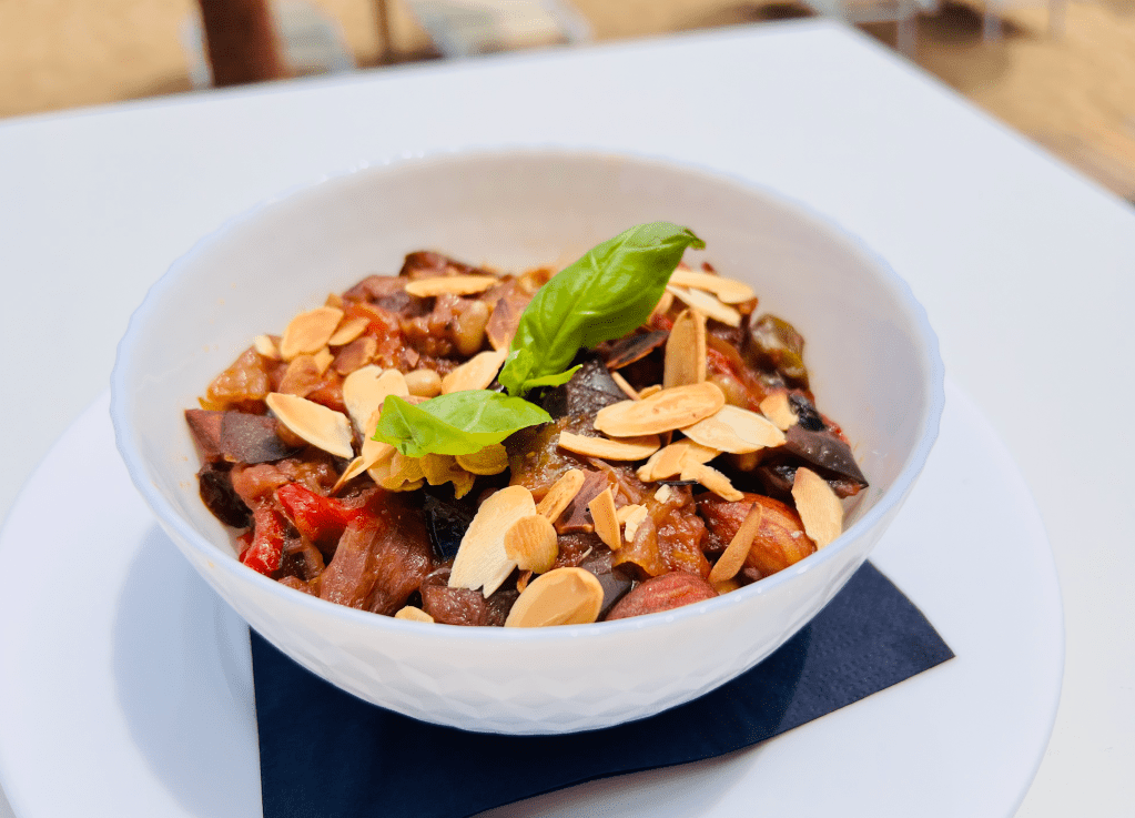 Pesce spada* a tocchetti, carota, sedano, cipolla, melanzane, peperoni, pinoli, mentuccia, basilico. [4, 8, 9]