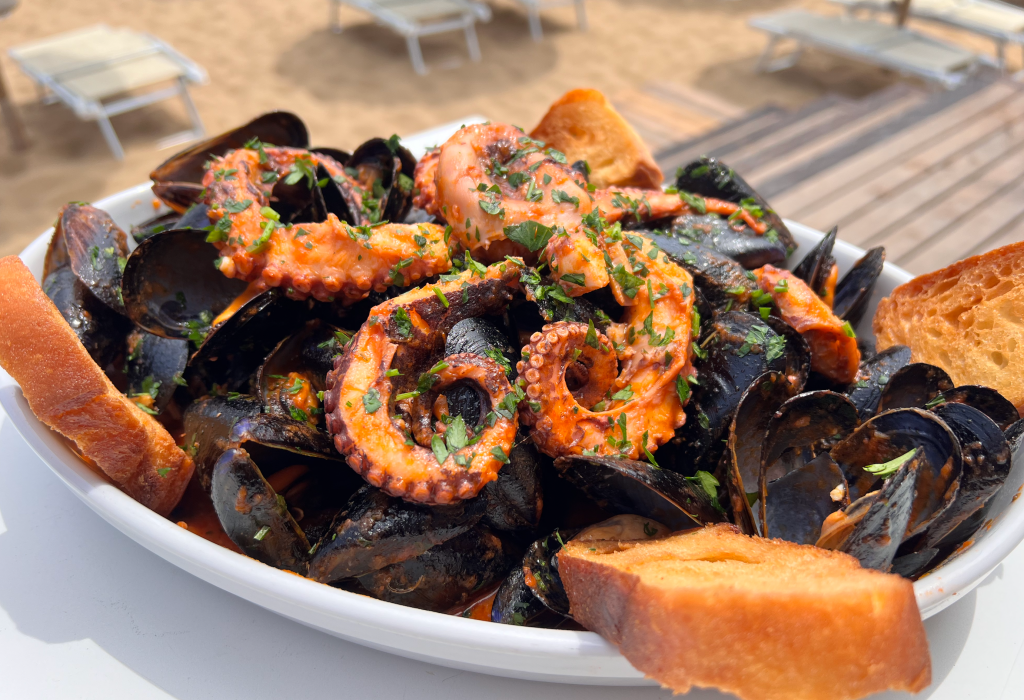 Cozze, polpo*, salsa di pomodoro fresco e vino bianco. [12 ,14]
