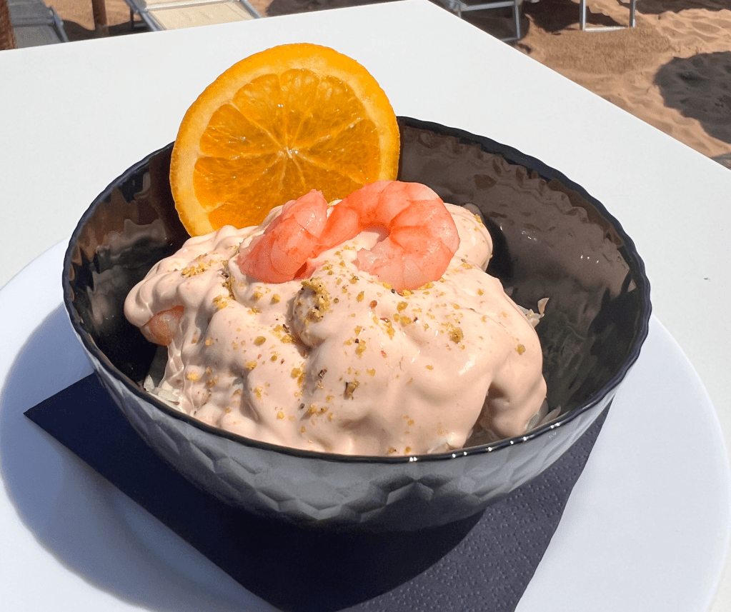 Julienne di iceberg con gamberi* mazzancolle, salsa dello Chef e arance di Sicilia. [2, 3, 4, 6, 7, 8, 10, 12]