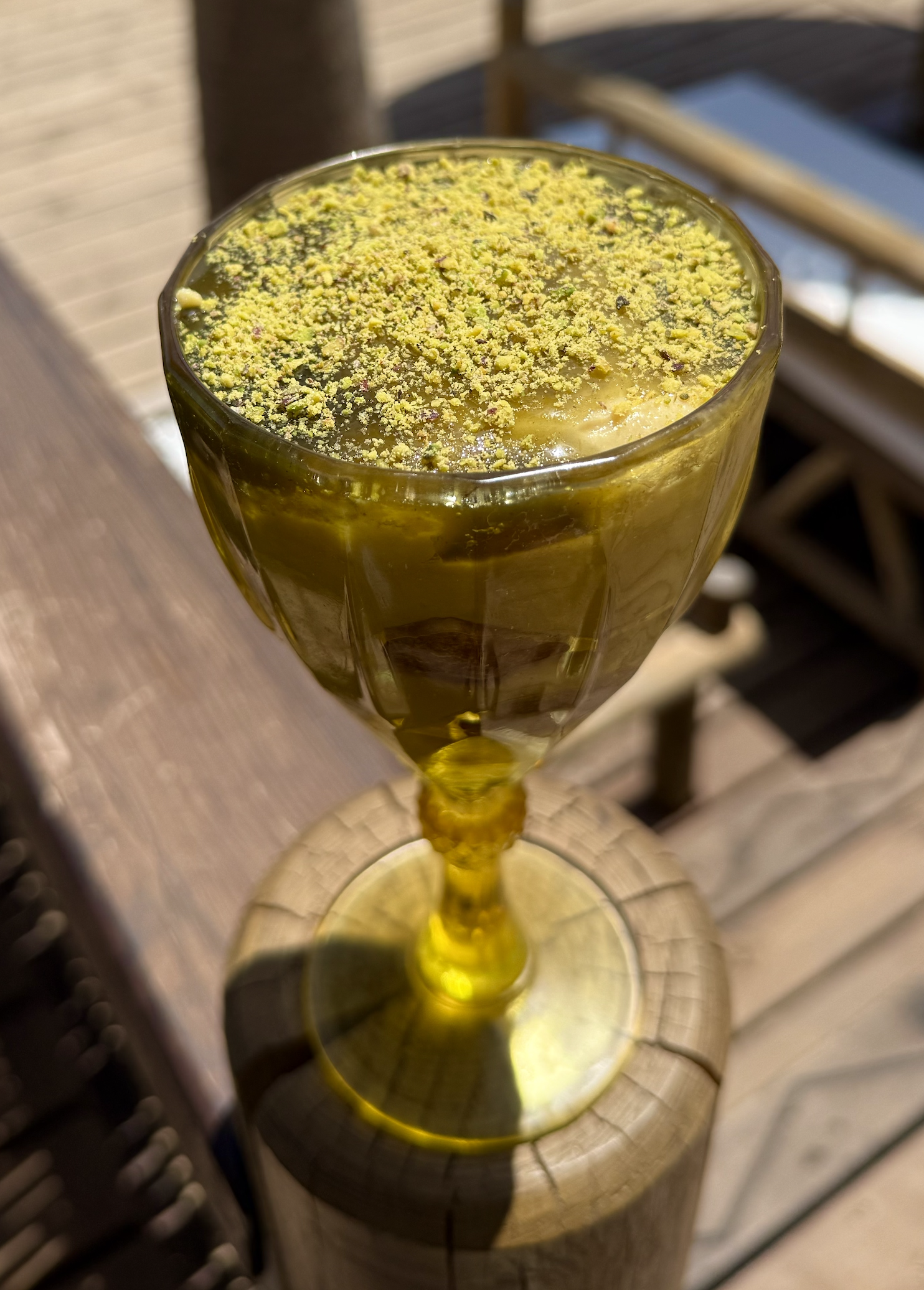 Savoiardi biscuits with coffee syrup, ricotta cheese, cream, pistachio cream and pistachio flour. [1, 3, 6, 7, 8, 10]