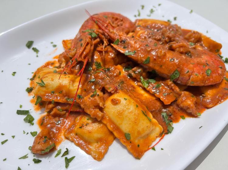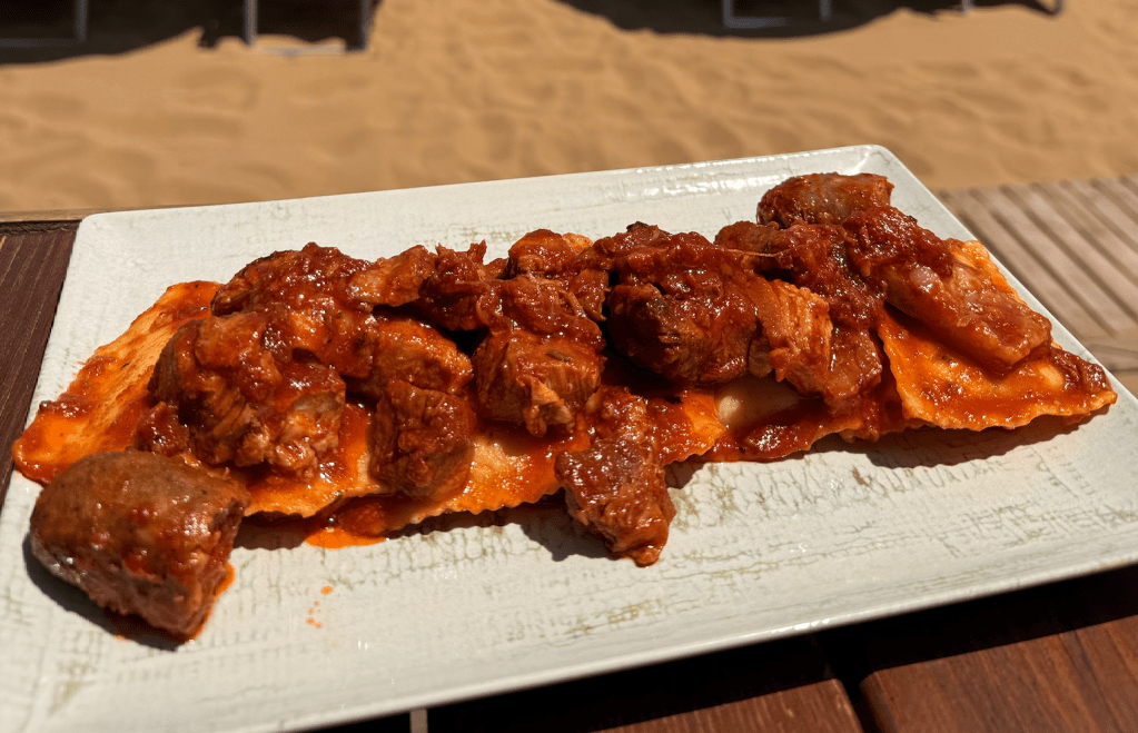 Ravioli filled with cow’s milk ricotta, tomato extract, sausage, pork ribs and loin. [1, 3, 9, 12]