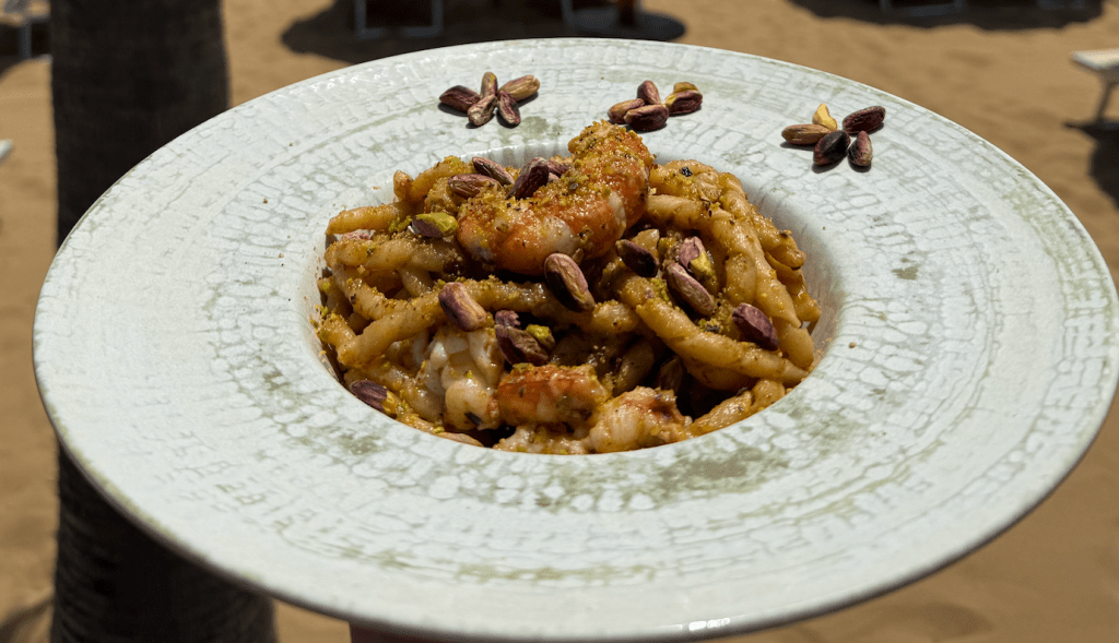 Busiate with Sicilian DOC pistachio cream, bèchamel of the chef and red shrimp*. [1, 2, 8]