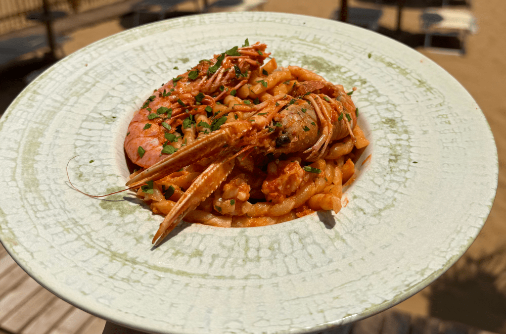 Busiate with scampi* and prawn* bisque. [1, 2]