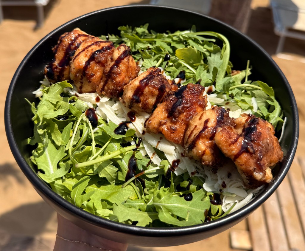 Sliced chicken breast with 00 flour, flakes, rocket and balsamic vinegar glaze. [1, 7, 12]